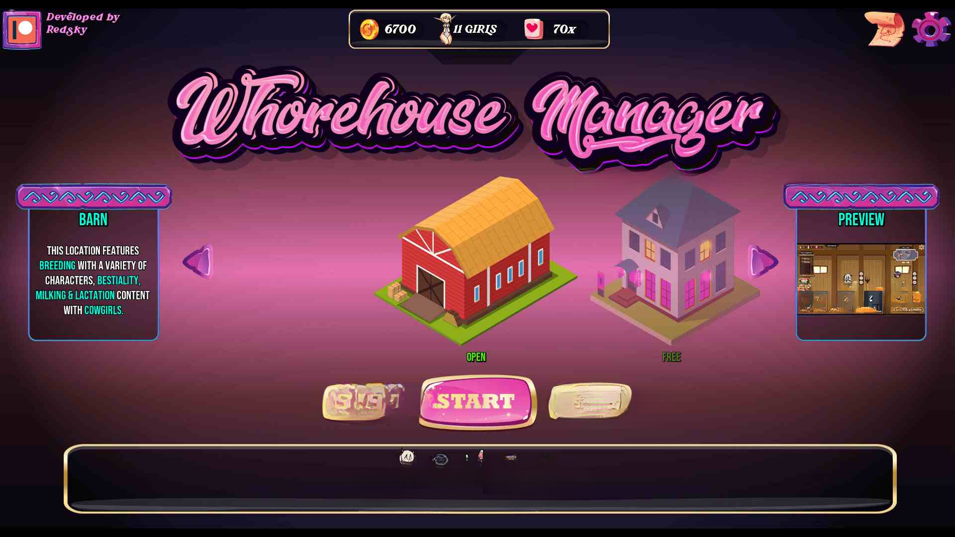 作为 Redsky 的第一款游戏,《妓院经理》是一款结合了赤壁风格和动漫风格的终极妓院游戏。一切都完全动画化,界面流畅易用,为玩家提供最佳体验和有前途的内容!