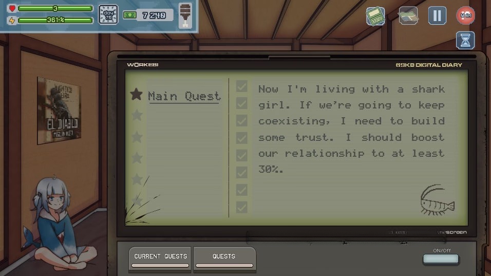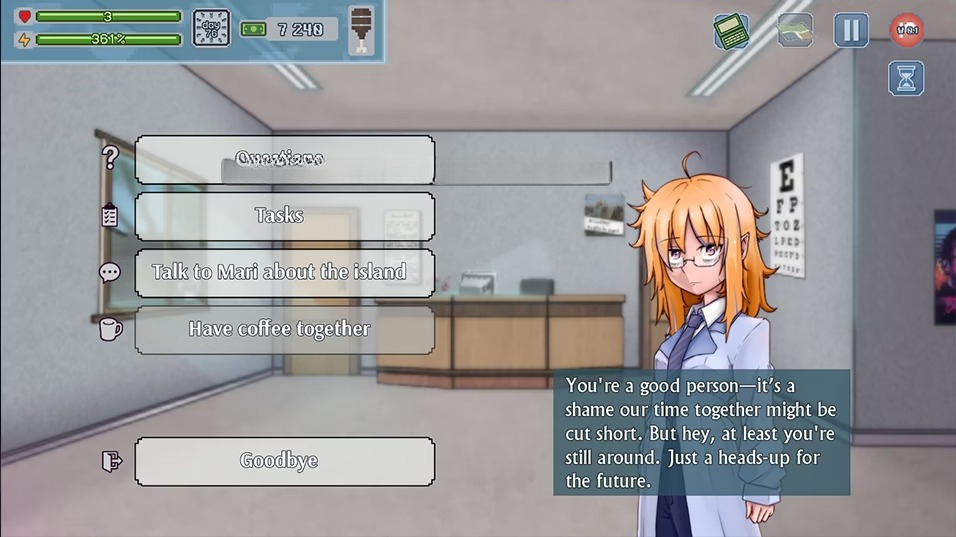 这是一款非线杏视觉小说,拥有开放世界和生活模拟/管理元素:探索岛屿,让医院重振,升级你的家园,赚钱,如果你敢的话,尝试与那个带着鲨鱼尾巴的不可预测客人共筑生活。你的选择、对话语气和进程直接改变场景、可选选项,甚至故事节奏。”