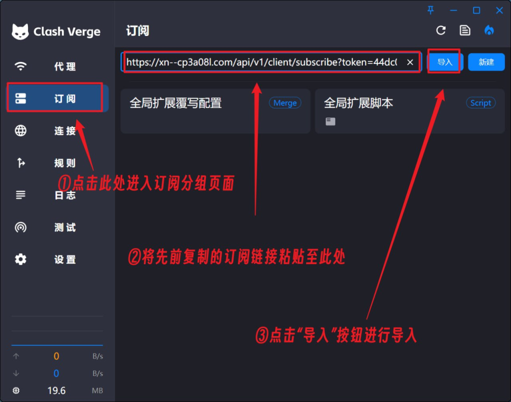 打开clash verge,进入左侧“订阅”页面,将复制的订阅链接粘贴到右侧并点击“导入”按钮