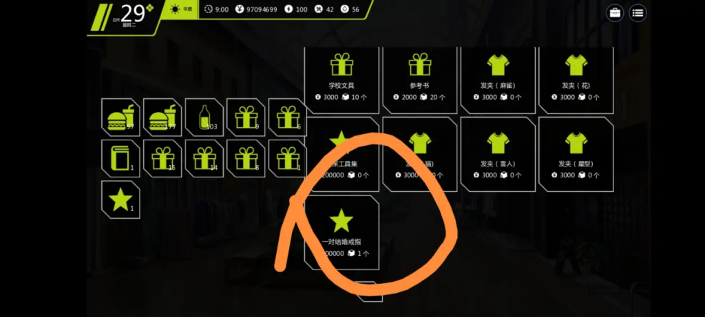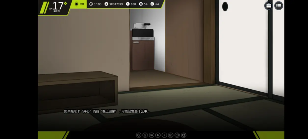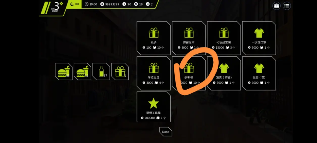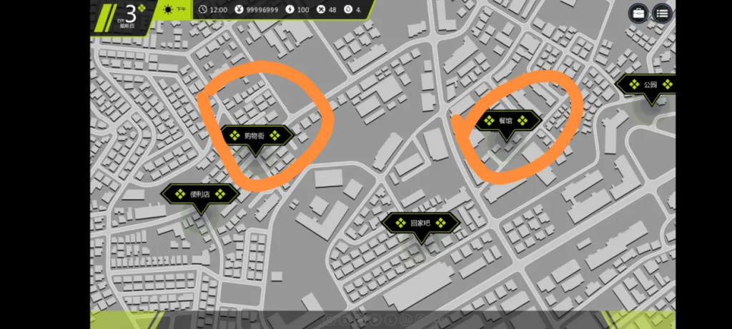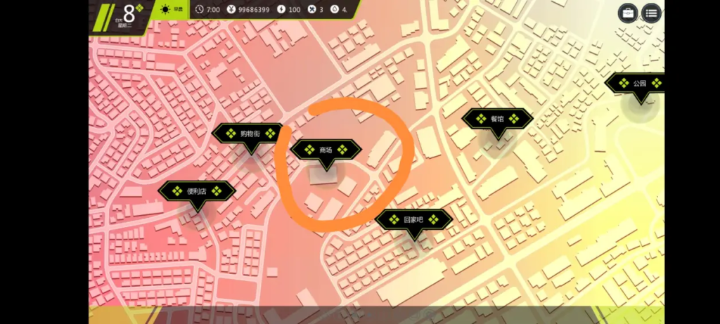 第三天刷出来餐馆和购物街,记住这两个地方,#餐馆的6个小时打工加1个小时吃饭时间能完美契合每天的流程,我的建议是买第二个听起来就很日系的日餐(回40体力50饱腹40水谁不爱呢)#购物街的礼品店能买参考书,这个一定要常备几本,没有参考书就没办法和冬佳学习,自律规律的生活会被打破,还会影响后面逃学的选择