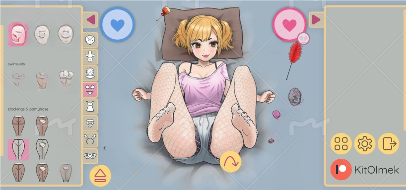 大致玩法: 点击互动,可随意更改任何配饰,发型、眼睛、口红、眼镜、衣服、小玩具、内衣、丝袜、纹身、捆绑等,颜色也可自己调试,如果不想花时间在搭配上,可点第一个界面的一键换装,全衣物随机搭配、仅丝袜内衣内裤随机搭配、全裸随机搭配。这游戏好像还有好感度以及一个天使恶魔的选择?没咋研究,大概是性格之类的。