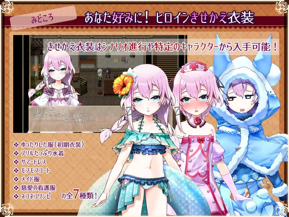 游戏介绍· 在不可思议的地方相遇的失忆的少女索菲(名字可更改) 她不停地说着“必须回家”,主人公便带着她踏上了找回记忆的旅程 在尚未开发的常夏海边、一年一度庆典热闹的美食之都、以及充满个性的商业都市 与旅途中相遇的居民们交流,各种各样的经历,让少女一点点地发生改变…… 坚固的羁绊所迎接的,会是甜蜜缠绵、如胶似漆的爱情,还是……?