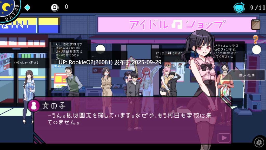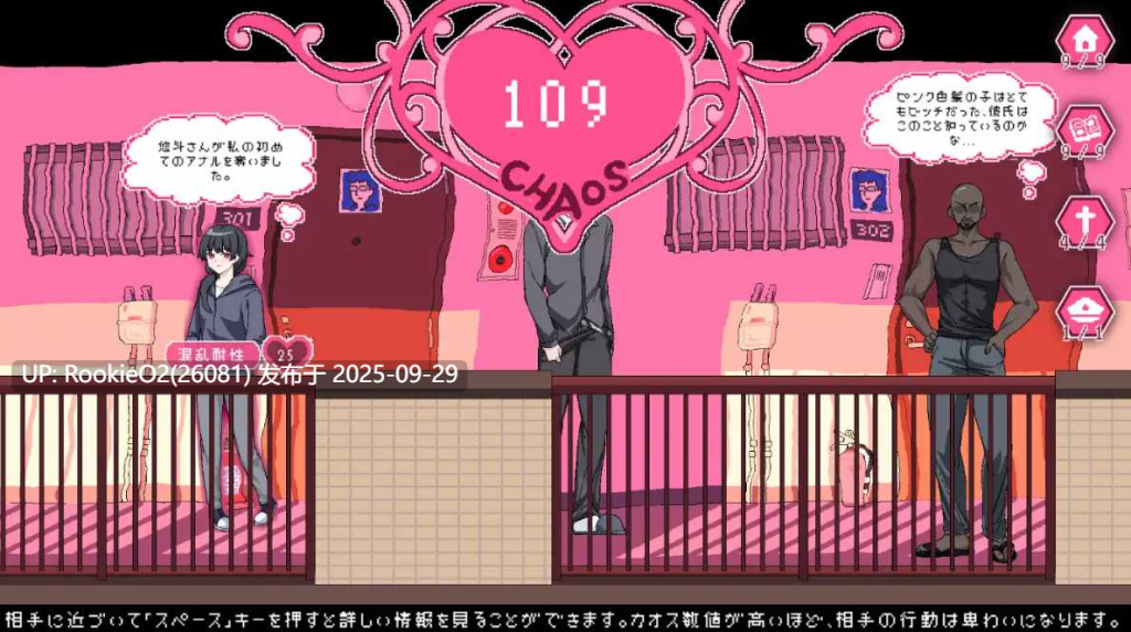 有趣的游戏玩法和几个迷你游戏 可以偷偷收藏并利用审查过程中的图片去达成你想要的目的。 另外,审查工作的质量可能对现实产生影响,比如影响到社区和NPC的行为。 H动画 有超过60个像素动画和200多个变化。 众多可互动NPC和支线任务 游戏中有大约30个NPC,远超市场上发佈的平均水平。一定数量的NPC是可以攻略的! 很多迷你游戏 除了审查游戏,悠斗还有几个需要克服的挑战。 更新内容: v3.1.4 兼容版本3.0.14的存档文件。 改进了漫画转换边框的对齐。 修复了前台女士的混乱肖像。 修正了Mai的混乱要求(从67改为70)。 修复了教堂外部地图的下午背景。 修复了印章收集任务的奖励。 接下来几天,我们将根据收到的反馈进一步打磨小游戏,并准备一个DLsite的演示版。此外,关于免费DLC的公告也会很快发布。由于我们内部还在讨论最好的处理方式,请耐心等待。 v3.1.3 在腐化Rika之前,不能在夜间停留在教堂区域(连花园也不行)。 更改了动漫展邮票收藏的奖励为1000元和一个硬盘,并可以见到Yui。 合唱和振动游戏的难度大幅降低。 修复了内存泄漏问题。 修复了强壮男和粉发女孩任务奖励的通知问题。 404错误模式仍然会增加混乱值。 添加了审查工作系统的翻译。 增加了移动速度。 宗教团体愿望任务的奖励从600增加到1000。 从自慰/H行为增加的情绪从1增加到2。 审查工作中性照片泄漏时,每张照片增加的混乱值从2增加到3。 降低了海报的价格并增加了效果。 修复了玩家在混乱世界视图中可以点击常规UI的bug。 部分修复了地图边界问题。 v3.1.2 在动漫展地图图标上添加了鼠标悬停时的翻译。 玩家可以完成Misa的“窥视第3层垃圾房”任务,无论里面是情侣的性行为还是老男人和粉发女孩的H行为。 增加了默认行走速度(从70->130)。 动漫小游戏奖励从1500~2000改为2500每次。 传送门价格降至600(最初为1000-2000)。 收到动漫展票后即可购买传送门。 启用垂直同步。 默认SFX音量降低到0.15(比以前少噪音)。 按空格键跳过对话可能会导致bug,因此现在只允许点击屏幕进行对话。 玩家窥视教堂窗户后,第二天回到合唱时会提示先完成Miyu的任务。 当玩家腐化Misa并获得公交卡和票(但尚未收集Yui的照片)时,添加了提示告知玩家前往动漫展/教堂;收集所有Yui照片后(但尚未收集Rika的照片)会有提示。 在完成任务前关闭邮件任务时,任务图标仍会闪烁。 修复了“调查第3层垃圾房”任务描述中的翻译问题({0}问题)。 选择UI(按H行为时会显示选择的UI)添加了位置和时间信息(适用于所有角色)。 更改了老男人和商店女孩的性位置(现在是在海报店的左侧)。 不再强制观看老男人和商店女孩的H行为,玩家可以选择是否窥视,只要接近到足够的距离。 其他修复: 修复了多次尝试后没有Misa照片的bug。 修复了coser展位(Sakura)锁定bug。 修复了忏悔性行为黑屏bug。 修复了菜单页面点击主页按钮导致黑屏的bug。 修复了文件夹路径包含”+#?”导致的bug。 支持旧的存档文件(从3.0.14和3.1.0版本)。 修复了Day 20的软锁bug。 修复了FMC数据面板图标错位bug。 修复了审查工作中某些部分没有翻译的bug。 修复了“混乱值”最高上限显示为“20”但应为“120”的bug。 修复了混乱事件后,前台女孩(在动漫展)没有更换衣服的问题。 修复了即使购买了物品,依然无法触发安全展位性行为的bug。 在选择页面(H行为动作)添加了额外的行,告诉玩家要向右滚动以查看所有选项。 在混乱世界中添加了一行,告诉玩家混乱值越高会触发更多猥亵事件。 修复了部分角色无法渲染的bug。 修复了怀孕状态总是被重置为0的bug(如果已经怀孕,则不再改变为干净状态)。 修复了女孩们的粉色轮廓bug。 修复了宗教团体仍在教堂过夜的问题。 添加了更多信息来解锁教堂的性派对场景。——完全腐化Rika并完成宗教团体的所有需求。 添加了教堂中天使(七星先生)的思考气泡。 修复了宗教团体在教堂外的排序层问题。 修复了调查第3层垃圾房任务描述中的翻译问题({0}问题)。 修复了收集照片到相册中不会增加混乱值的问题(尽管我们认为它是一个错误结果)。 (当混乱值>30时)MC完成安全展位场景后,遇到老男人和商店女孩的外遇导致的bug。